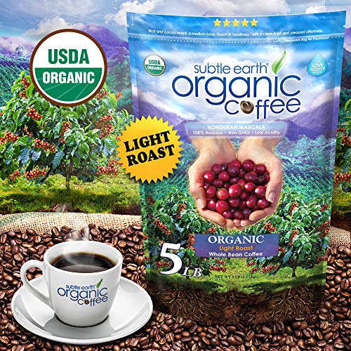 Subtle Earth Organic Coffee – Light Roast – Whole Bean Coffee – 100% Arabica Beans – Low Acidity and Non-GMO – 5lb bag