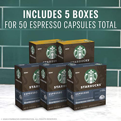 INCLUDES: Enjoy the Starbucks coffee you love with a variety of espressos that includes Starbucks Blonde Espresso Roast and Starbucks Espresso Roast —two different varieties for a total of 50 espresso capsules for Nespresso Vertuo machines