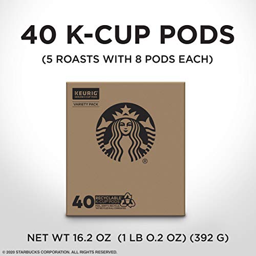 Starbucks Black Coffee Variety Pack includes 5 roasts with 8 pods each (40 total K-Cup pods)